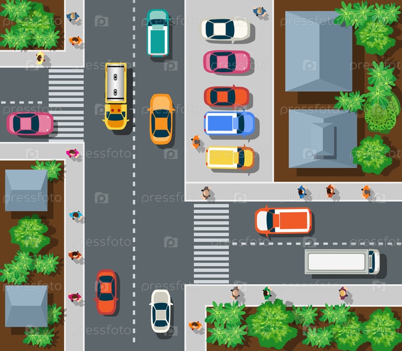 Вид сверху на город. Вид на городские перекрестки с автомобилями и домами
