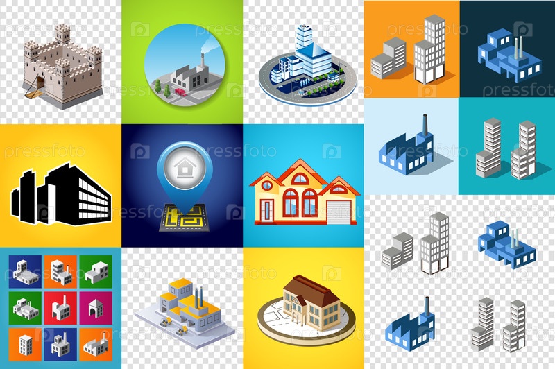 Большой комплект дизайнерских шаблонов, элементов дизайна, изометрических объектов зданий