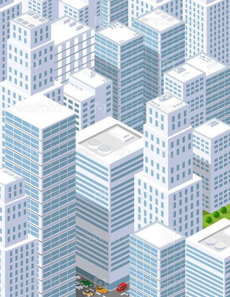 Большой город изометрических городских объектов. Набор городских зданий, небоскребов, домов, супермаркетов, дорог и улиц