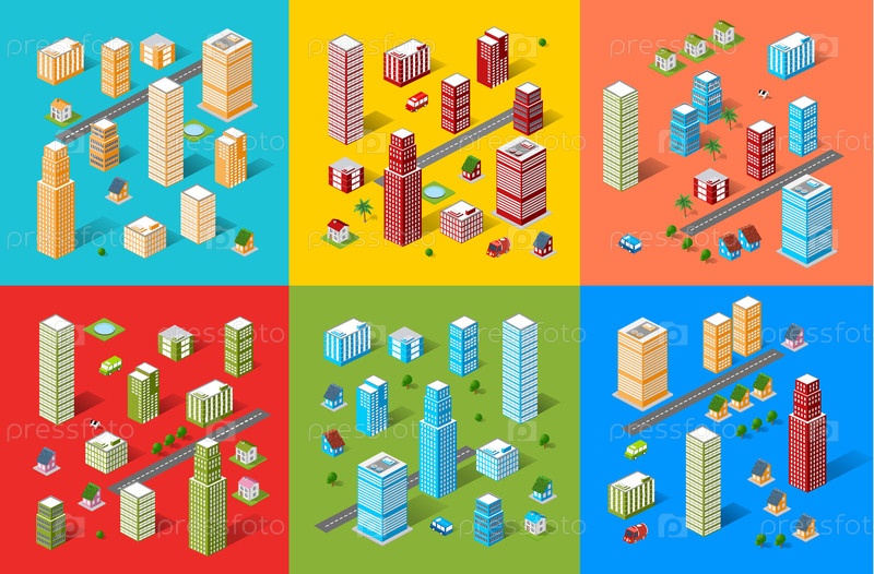 Изометрическая карта города дороги, деревья и строительные элементы дома устанавливают изолированные векторные иллюстрации