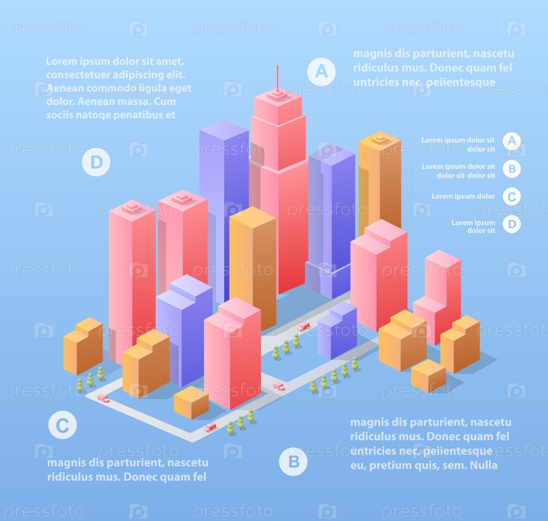 Деловой изометрический город с множеством различных домов, офисов, небоскребов, супермаркетов и улиц с трафиком