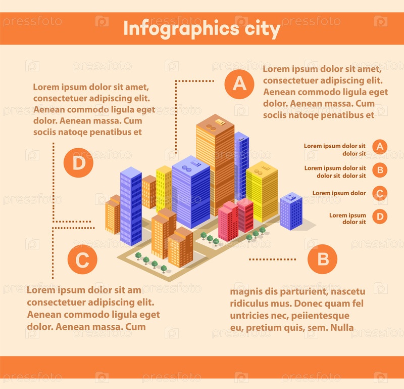 Деловой изометрический город с множеством различных домов, офисов, небоскребов, супермаркетов и улиц с трафиком