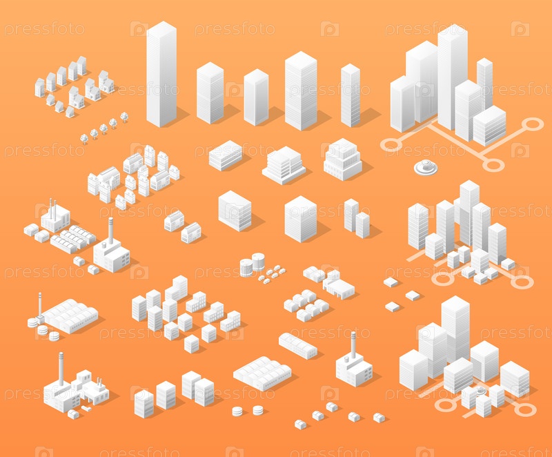 Векторный изометрический центр города на карте с большим количеством зданий, небоскребов, заводов, парков и транспортных средств. Изометрический вид крупного современного городского бизнеса