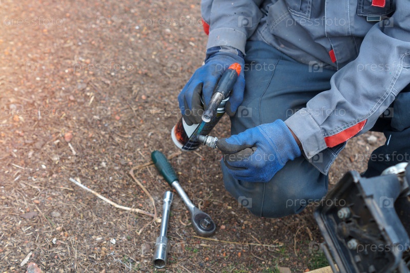 Быстрая сушка мокрой свечи для мотоблока - работник прокаливает свечку горелкой