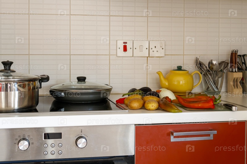 Плита с кастрюлей и сковородой и стол со свежими овощами на домашней кухне