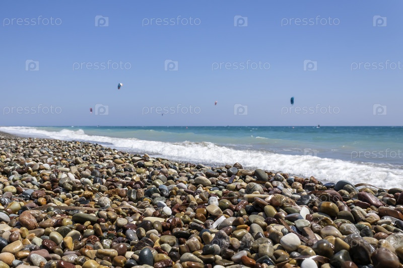 Морской галечный пляж с кайтами для серфинга в голубом небе