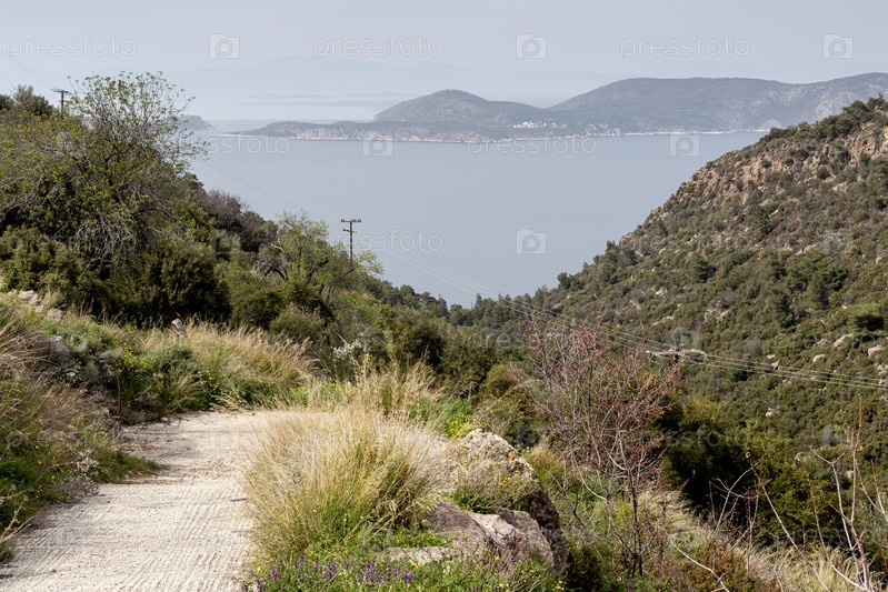 Дорога в горы рядом с деревней с видом на море (остров Скирос, Греция)