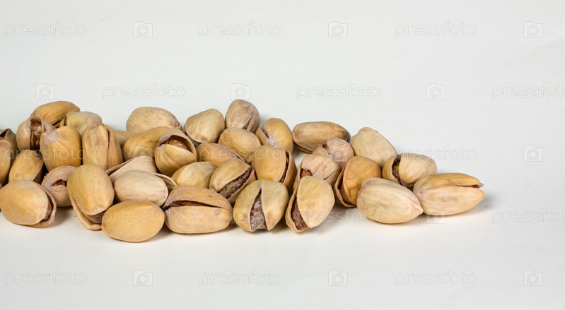 Много соленых фисташек на белом фоне