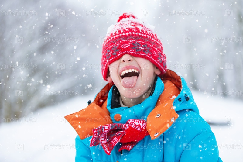 Смешной мальчик в синей зимней одежде гуляет во время снегопада. Зимние мероприятия для детей. Симпатичный ребенок в теплой шляпе низко над глазами ловит снежинки языком