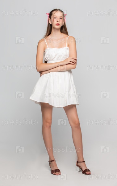 Красивая романтичная молодая девушка в белом коротком платье позирует в студии на сером фоне