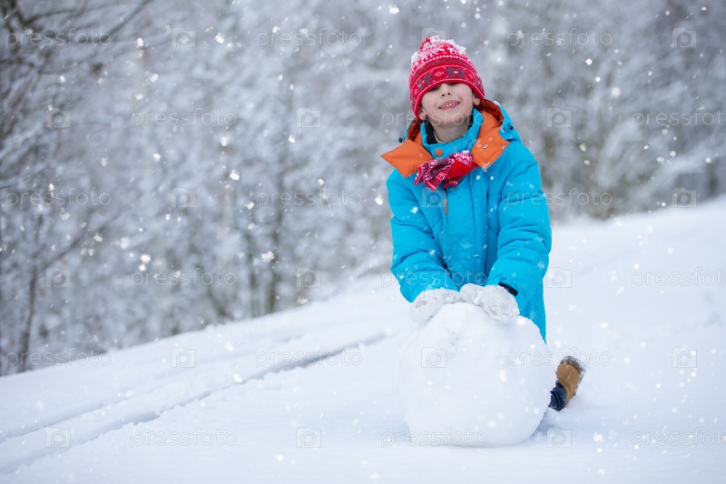 Счастливый мальчик с большим снежным шаром. Концепция счастливых зимних каникул
