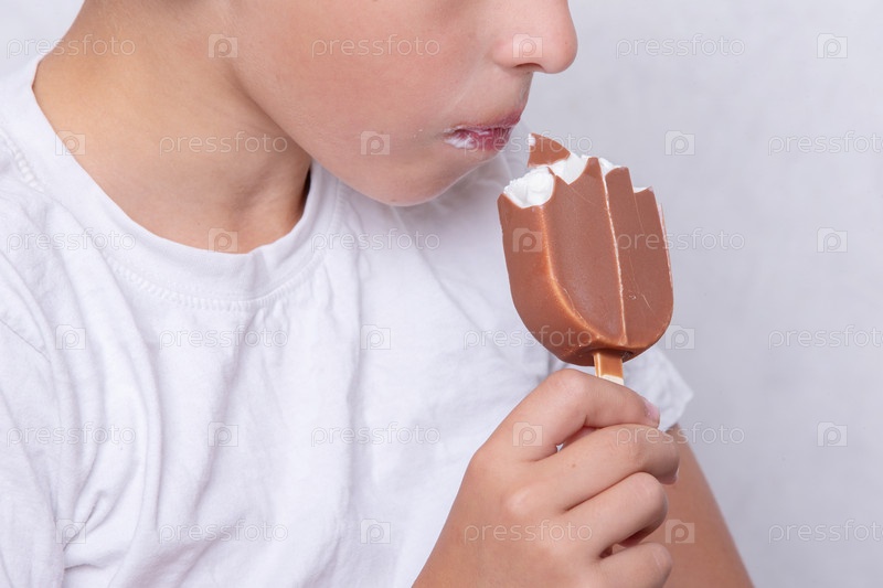 Мальчик, чье лицо неузнаваемо, ест мороженое, покрытое шоколадом