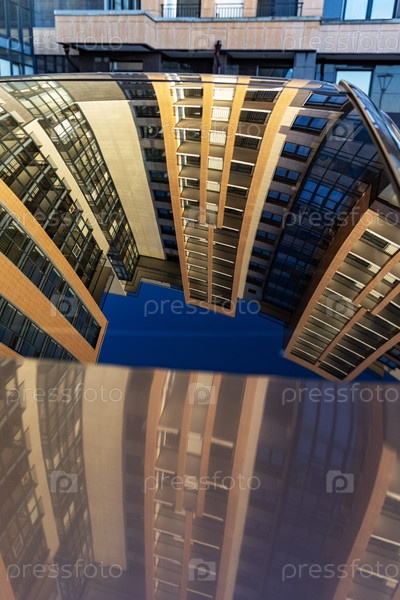 Россия. Санкт-Петербург. Отражение фасада многоэтажного дома в стекле автомобиля. Россия. Санкт-Петербург. Отражение фасада многоэтажного здания в стекле машины