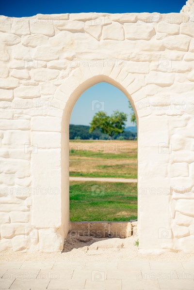 Живописный вид через арочный проход в старой белой каменной стене. Россия