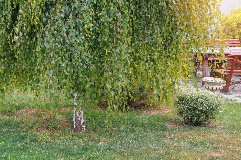 Гималайская снежно-белая береза с длинной пушистой прической зеленых листьев - зонтичной плакучей кроной стоит рядом с местом отдыха в саду