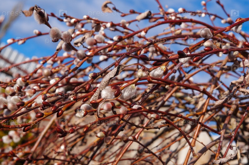 Пушистые почки козьей ивы (Salix caprea) на фоне синего весеннего неба