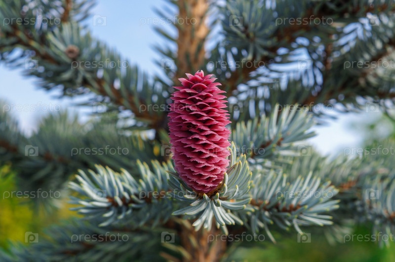 Большой розовый пузырь на ветвях голубой ели Picea asperata (ель сероватая)