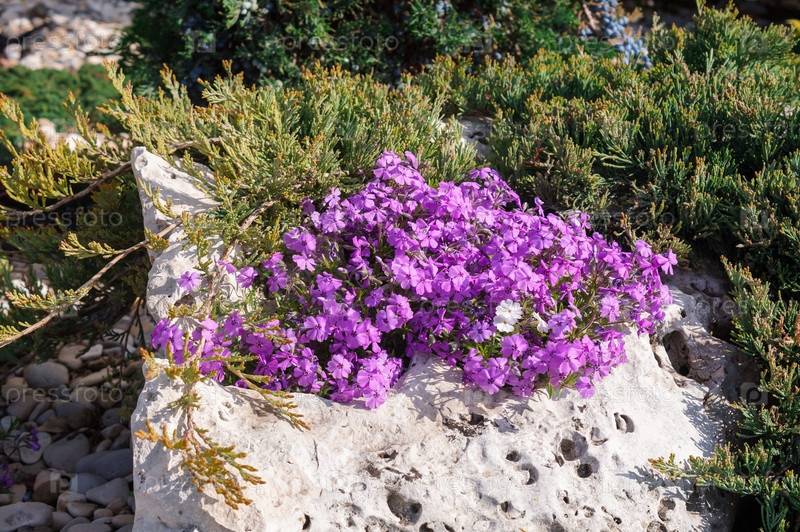 Цветение маленьких сиреневых флоксов в большом камне в композиции с хвоей и галькой