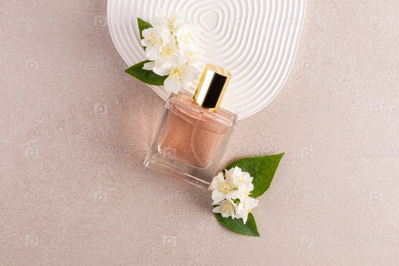 Стеклянная бутылка женских духов с ароматом жасмина опирается на рельефный подиум со свежими цветами жасмина. Пустой макет бутылки. Копирование пространства