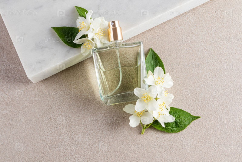 Элегантная бутылка духов опирается на белый мраморный подиум с цветами жасмина. Пустой макет бутылки. Презентация аромата. Бежевый каменный фон