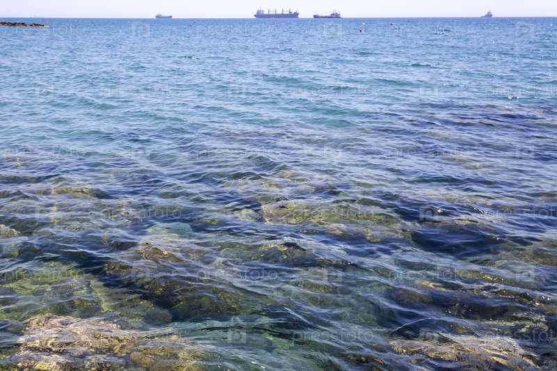 Морская гладь с камнями на дне и кораблями на горизонте