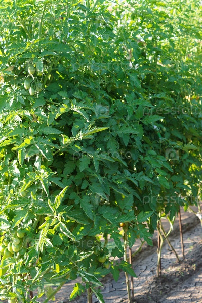 Грядки высоких густых кустов помидоры с завязывающимися плодами
