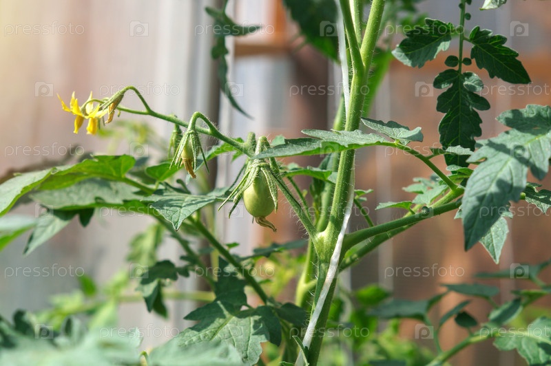 Зеленые помидорки завязываются на цветущем кусте