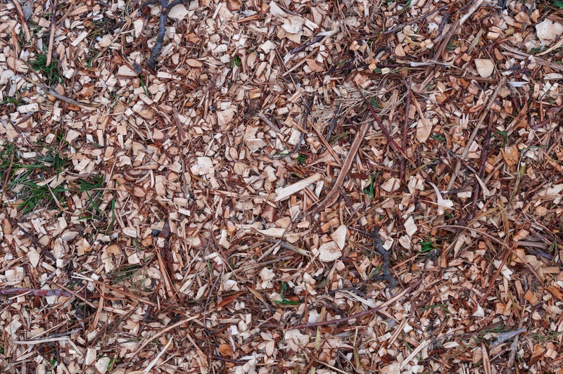 Фон - Рассыпанная на землю мульча из различных веток деревьев с прорастающей травой