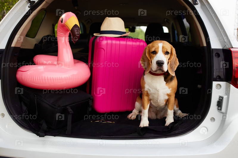 Милая собака-бигль в солнцезащитных очках сидит в багажнике автомобиля