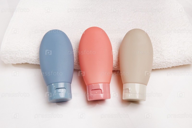 Три красочные компактные бутылки для косметики, лежащие на белом полотенце, идеально подходят для путешествий
