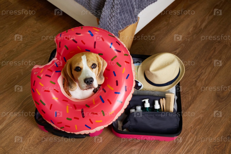 Собака-бигль в чемодане с вещами для летнего отдыха на море