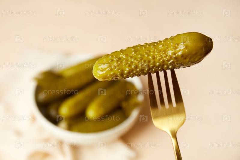 Вилка с маринованными огурцами. Домашние соленья в банке на светлом фоне