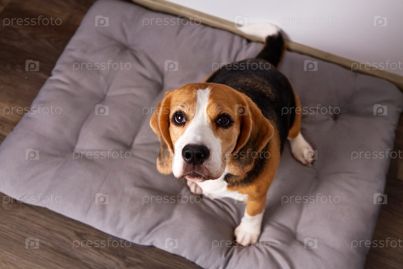 Бигльская собака сидит на мягкой кровати
