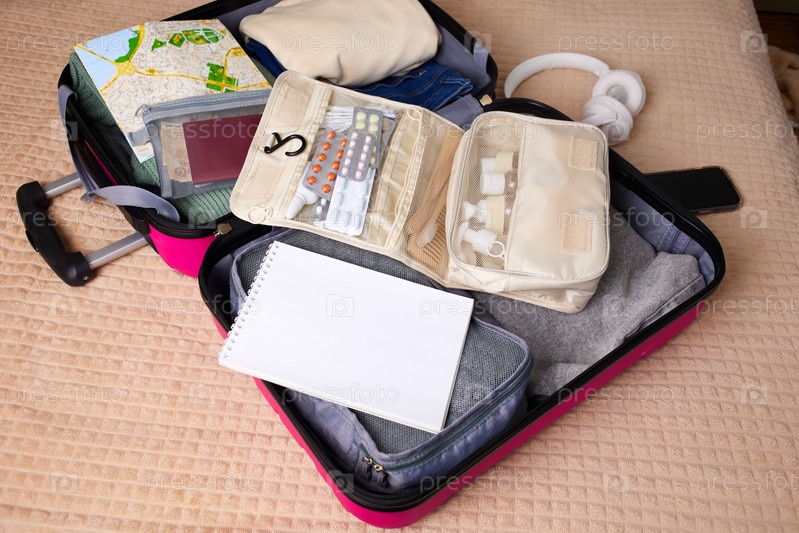 Открытый чемодан с набором косметических и гигиенических средств, одеждой, путеводителем