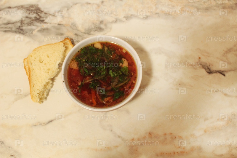 Борщ и белый хлеб на светлом фоне. Местная еда