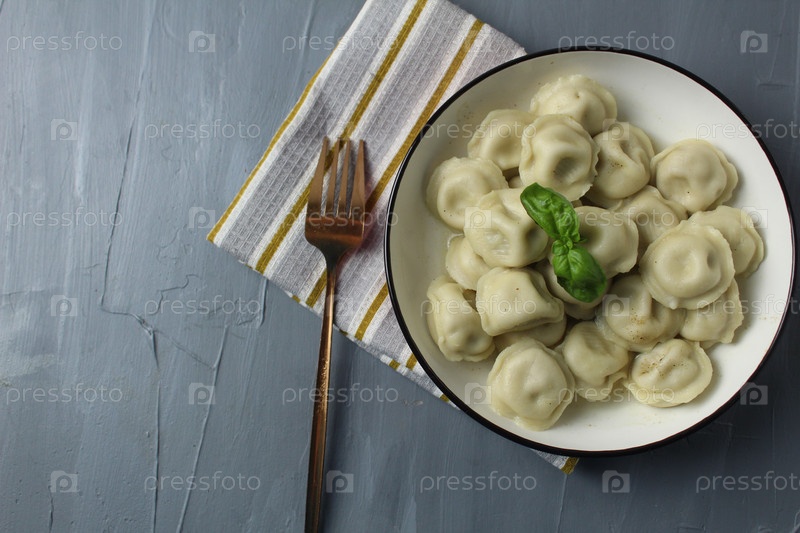 Пельмени распаривали пироги в пластинчатой вилке на столовой салфетке на сером фоне с пространством для текстового копировального пространства верхнего угла