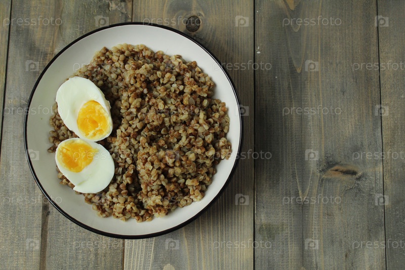 Вареная гречка и две половинки яйца с ярким желтком в миске на сером фоне с пространством для текста