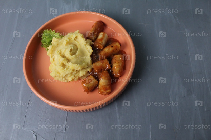 Обед пюре и колбас в томатном соусе на тарелке на сером фоне. Домой Кухня Кухня Концепт