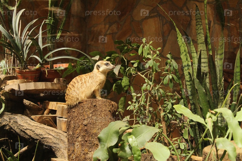 Суррикат сидит на траве и зелени в вольере зоопарка