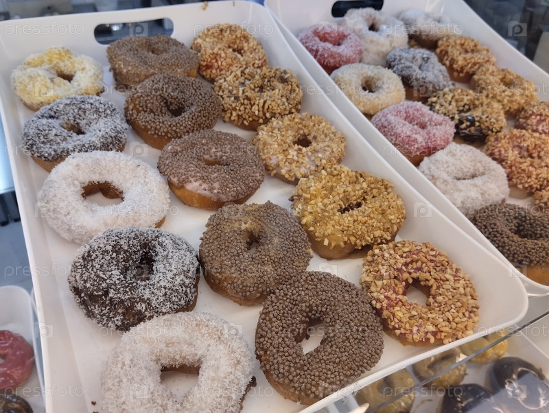 Аппетитные пончики находятся в окне кафе. Вынос. Сладкая еда