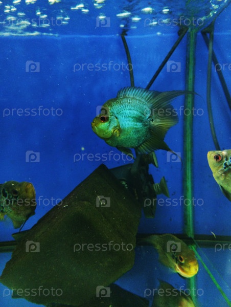 Цихлиды Цветочный рог мелких рыбок в аквариуме на синем водном фоне