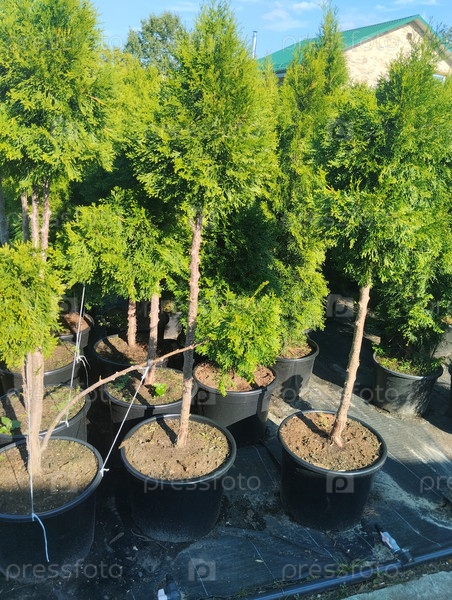 Саженцы деревьев в горшках. Ясли ели и саженцев туи