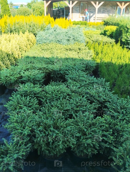 Детский сад, магазин саженцев деревьев. Семена деревьев, кусты в плантаторах. Вертикальная фотография