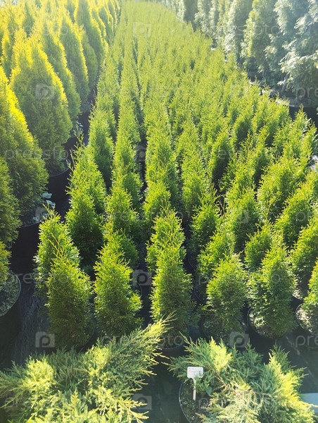 Длинные ряды с рассадой туи. Ясли с саженцами растений. Вертикальная фотография