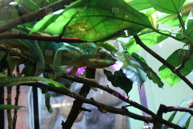Хамелеон, вид сбоку, прячется среди листьев. Смешные животные