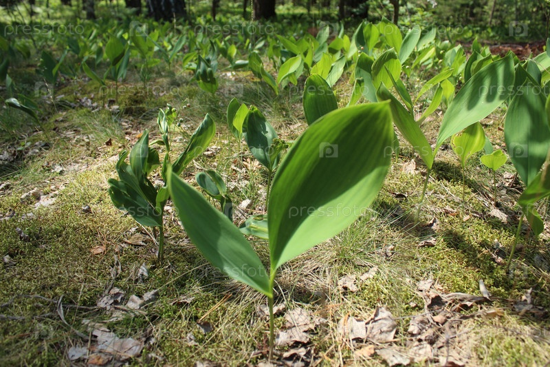 Лилия-оф-долины цветочное растение с большими зелеными листьями в лесу. Концепция лесных растений Цветы Дикие растения