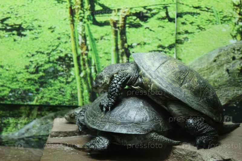 Спаривающиеся черепахи черные на зеленом фоне возле воды. Размножение черепах в неволе