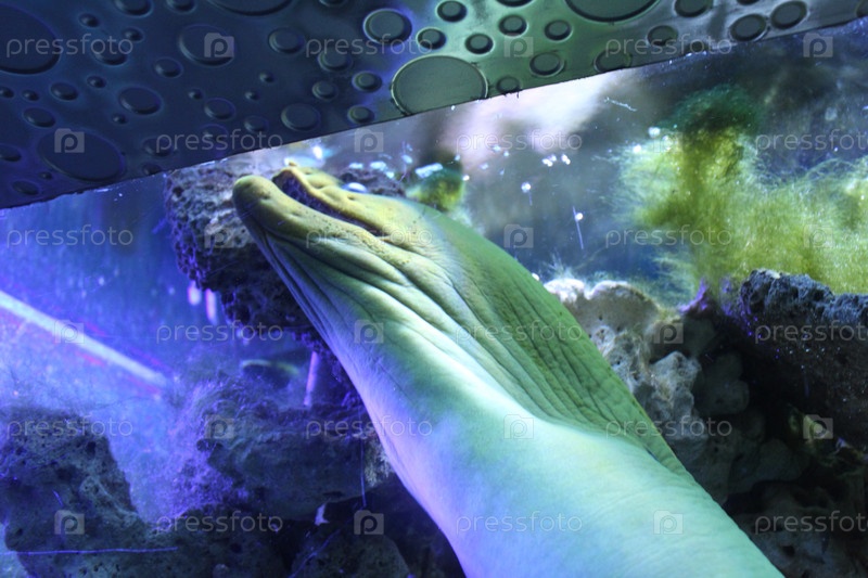 Желтый муреновый угорь крупным планом в воде зоопарка