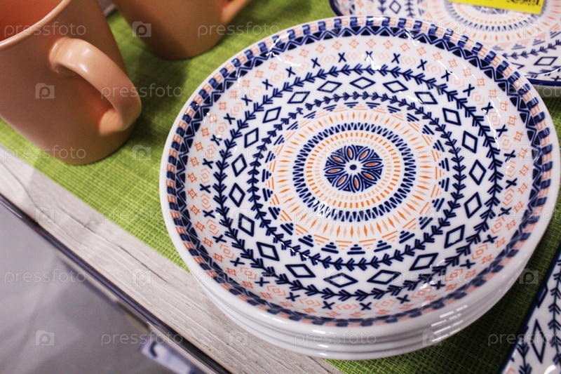 Глиняная пластина с синим рисунком на синем фоне. Раскрашенная посуда