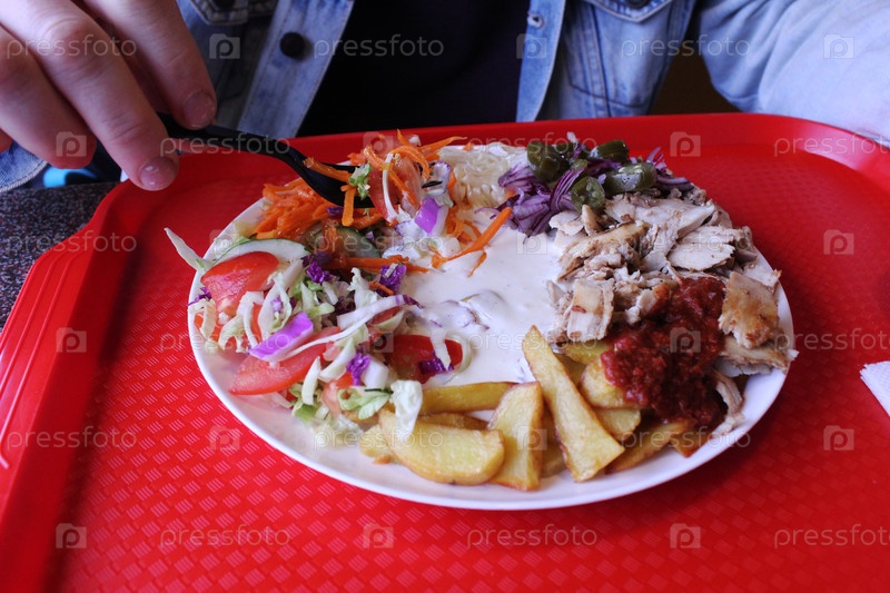 Парень ест шаурму. Фастфуд. Шаварма на тарелке, мясо, картофель, овощи с белым соусом на тарелке